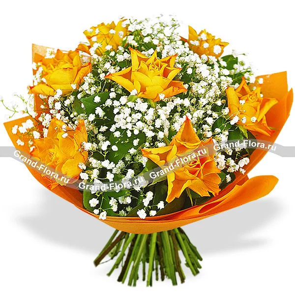ЛЮКС: роза оранжевая/желтая - 15 шт., гипсофила - 7 шт., фетр оранжевый. Примерный диаметр букета 40х40 см.